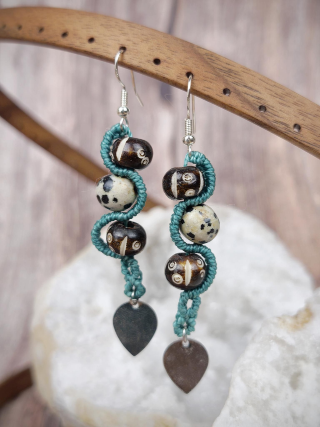 Matériaux : fil polyester ciré bleu, graines gravées d’Afrique du Sud, jaspe dalmatienne naturelle, acier inoxydable hypoallergénique, attache en argent 925